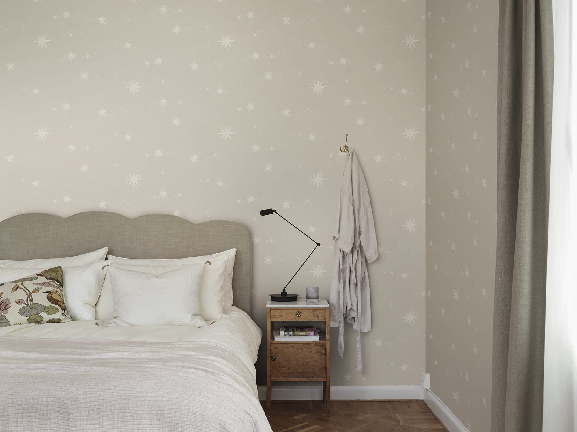 Ekskluzywny panel ścienny z kolekcji "Tidlosa", zaprojektowany przez Johannę Bradford dla szwedzkiego producenta oklein ściennych Sandberg. "Gillis" to piękne, ręcznie malowane gwiazdy, roztańczone na papierze niczym gwiazdy na nocnym niebie. Delikatna, jasnobeżowa kolorystyka sprawia, że całość prezentuje się nienachalnie i lekko. Projekt występuje w pięciu wersjach kolorystycznych. Pierwotnie miał służyć jako "marzycielska" tapeta sufitowa, jednak bez wątpienia równie pięknie będzie prezentować się też na ścianie. W wyjątkowy sposób udekoruje sypialnię, pokój młodzieżowy, czy też dziecięcy tworząc we wnętrzu przytulną i odprężającą atmosferę. Tapeta flizelinowa, odporna na zmywanie w stopniu dobrym, dzięki czemu można ją bardzo delikatnie przecierać ściereczką.