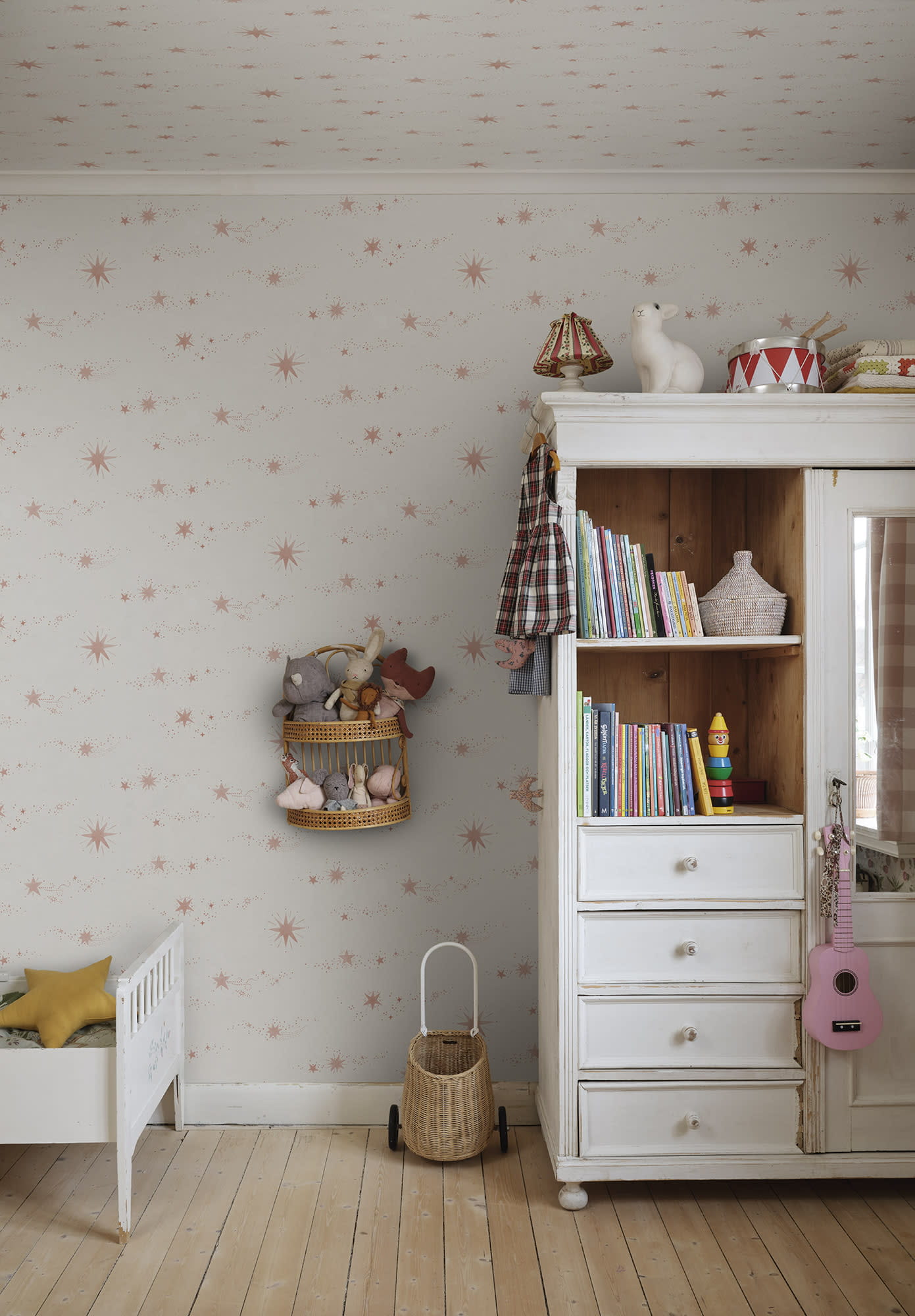 Ekskluzywny panel ścienny z kolekcji "Tidlosa", zaprojektowany przez Johannę Bradford dla szwedzkiego producenta oklein ściennych Sandberg. "Gillis" to piękne, ręcznie malowane gwiazdy, roztańczone na papierze niczym gwiazdy na nocnym niebie. Delikatna kolorystyka, będąca zestawieniem jasnego różu z bielą sprawia, że całość prezentuje się nienachalnie i lekko. Projekt występuje w pięciu wersjach kolorystycznych. Pierwotnie miał służyć jako "marzycielska" tapeta sufitowa, jednak bez wątpienia równie pięknie będzie prezentować się też na ścianie. W wyjątkowy sposób udekoruje sypialnię, pokój młodzieżowy, czy też dziecięcy tworząc we wnętrzu przytulną i odprężającą atmosferę. Tapeta flizelinowa, odporna na zmywanie w stopniu dobrym, dzięki czemu można ją bardzo delikatnie przecierać ściereczką.