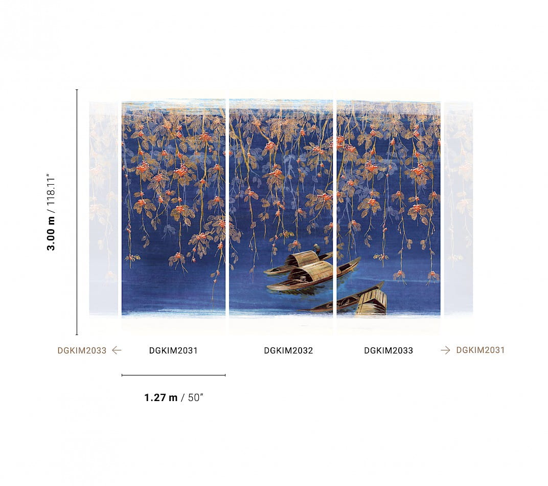 Mural Khroma Kimono River Night DGKIM2032 przedstawia krajobraz japońskiej rzeki. Zwisające gałęzie drzew oraz dryfujące na spokojnej wodzie drewniane łodzie, scalają się w jeden panoramiczny krajobraz, przenosząc widza do malowniczego kraju kwitnącej wiśni. Mural, składa się z trzech odrębnych paneli, które w całości tworzą szeroki wachlarz możliwości aranżacyjnych. Fototapeta na flizelinie dostępna w trzech wariantach kolorystycznych, daje możliwość dopasowania do konkretnych preferencji oraz charakteru pomieszczenia.