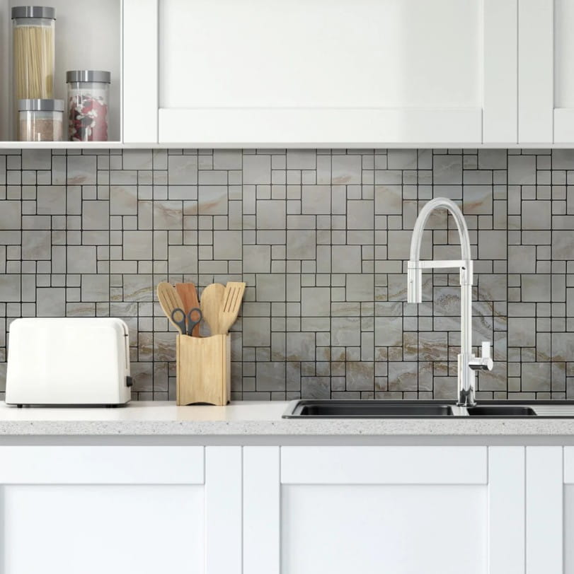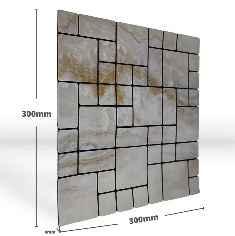 Montaż należy rozpocząć od jednego narożnika i delikatnie docisnąć płytki do powierzchni, upewniając się, że płytki są instalowane równomiernie i ostrożnie, unikając tworzenia się pęcherzyków i zmarszczek.