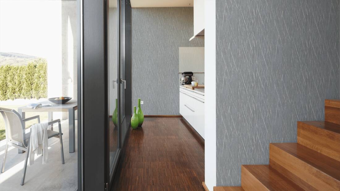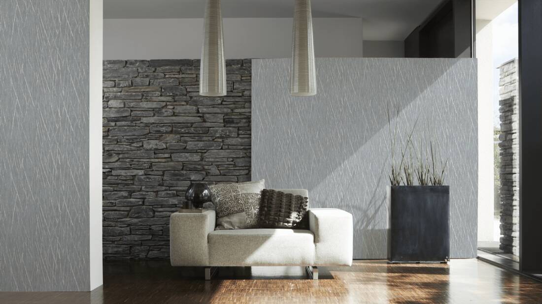 Struktura tapety jest twarda i lekko chropowata z wyczuwalną fakturą pionowego prążka. Wzór kresek jest wklęsły i idealnie gładki, posiada metaliczny, szampańsko-srebrny połysk. Tło tapety posiada matowe wykończenie i jest w odcieniach szarego.