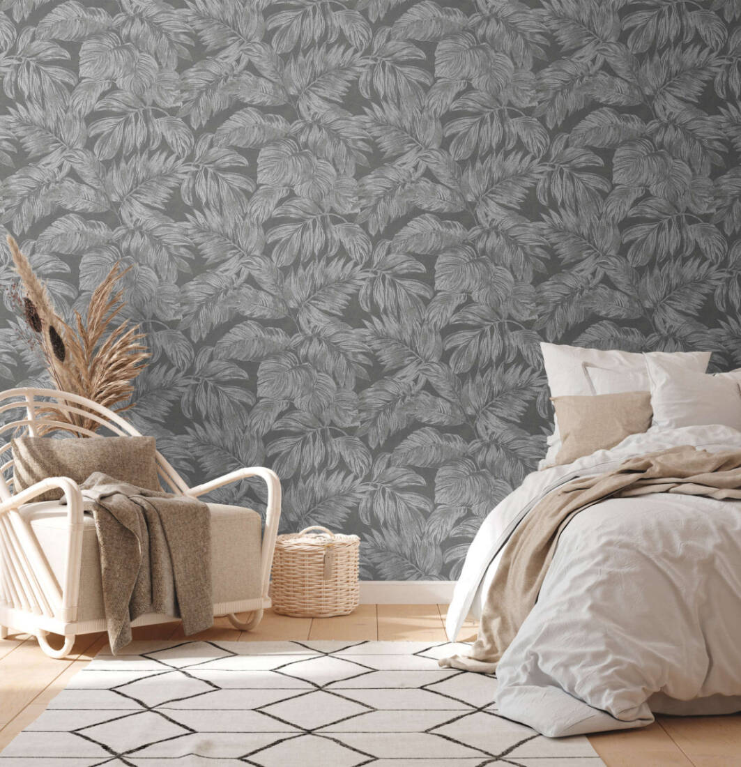 Tapeta 39340-4 z kolekcji Casual Living to propozycja z motywem przedstawiającym kilka rozmaitych rodzajów liści palmy. Drobne, podłużne listki czy też okazałe liście wielkości dłoni, to tylko część tego, czym może zaskoczyć tapeta w całej swojej odsłonie. Nieregularnie i gęsto rozmieszczone, zachowane w kolorystyce grafitowego oraz popielatego, efektywnie prezentują się na grafitowym tle, imitującym matowe płótno materiału. Metaliczno-srebrne zdobienia występujące na powierzchni liści, piękne mienią się pod wpływem działania światła, dodając tapecie szlachetnej elegancji. Tapeta w liście, to idealne rozwiązanie dla zwolenników klasycznych i prostych rozwiązań aranżacyjnych. Doskonale w pasuje się wystrój wnętrz w nowoczesnym i rustykalnym stylu. Sprawdzi się, jako samodzielna dekoracja ścian lub zestawiona z szeroką gamą wzorów z kolekcji Casual Living, stworzy wyjątkowy wystrój do salonu, jadalni, sypialni, gabinetu, pokoju młodzieżowego, nadając im niepowtarzalny i pełen energii charakter. Struktura tapety jest delikatnie tłoczona z lekko wyczuwalnym wklęśnięciem wzoru. Tapeta winylowa na flizelinie, charakteryzuje się bardzo dobrą odpornością na zmywanie, wierzch można przemywać wilgotną ściereczką.
