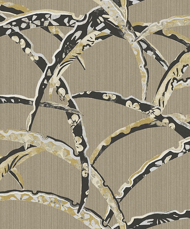 Tapeta Khroma Kimono KIM503 Daika Gold inspiruje swoją wszechstronnością i oryginalnym wzorem. Zaprezentowane na powierzchni kolorowe liście zaskakują swoją wielkością i rozpiętością, mogą przywodzić na myśl jesienny krajobraz pełen naturalnych barw i tekstur. Na liściach znajdują się nieregularnie rozmieszczone płatki kwiatów, co dodatkowo pozwala interpretować ten wzór na różne, abstrakcyjne sposoby. Tapeta ścienna wykonana w japońskim stylu, będzie doskonałą ozdobą dla salonu lub sypialni, dodając wnętrzu subtelnej, orientalnej atmosfery. Wyszukana kolorystyka, dodatkowo podkreśla unikatowość tej tapety. Zaprezentowane połączenie czarnego z złotym oraz różnorodnymi tonacjami beżowego i popielatego, pięknie prezentuje się na brązowym tle. Matowe wykończenie tworzy atmosferę naturalnego spokoju i harmonii. Jednak z bliska można dostrzec na tle tapety pionowe niteczki, wypełnione mieniącymi się pod wpływem światła drobinkami, co dodatkowo czyni ją bardziej wyjątkową. Sprawdzi się, jako samodzielna dekoracja ścian lub zestawiona z szeroką gamą wzorów z kolekcji Kimono, stworzy niesamowitą aranżację. Struktura tapety jest jednolita i przypomina w dotyku płótno tkaniny. Tapeta flizelinowa, charakteryzuje się dobrą odpornością na zmywanie, wierzch można bardzo delikatnie przecierać ściereczką.