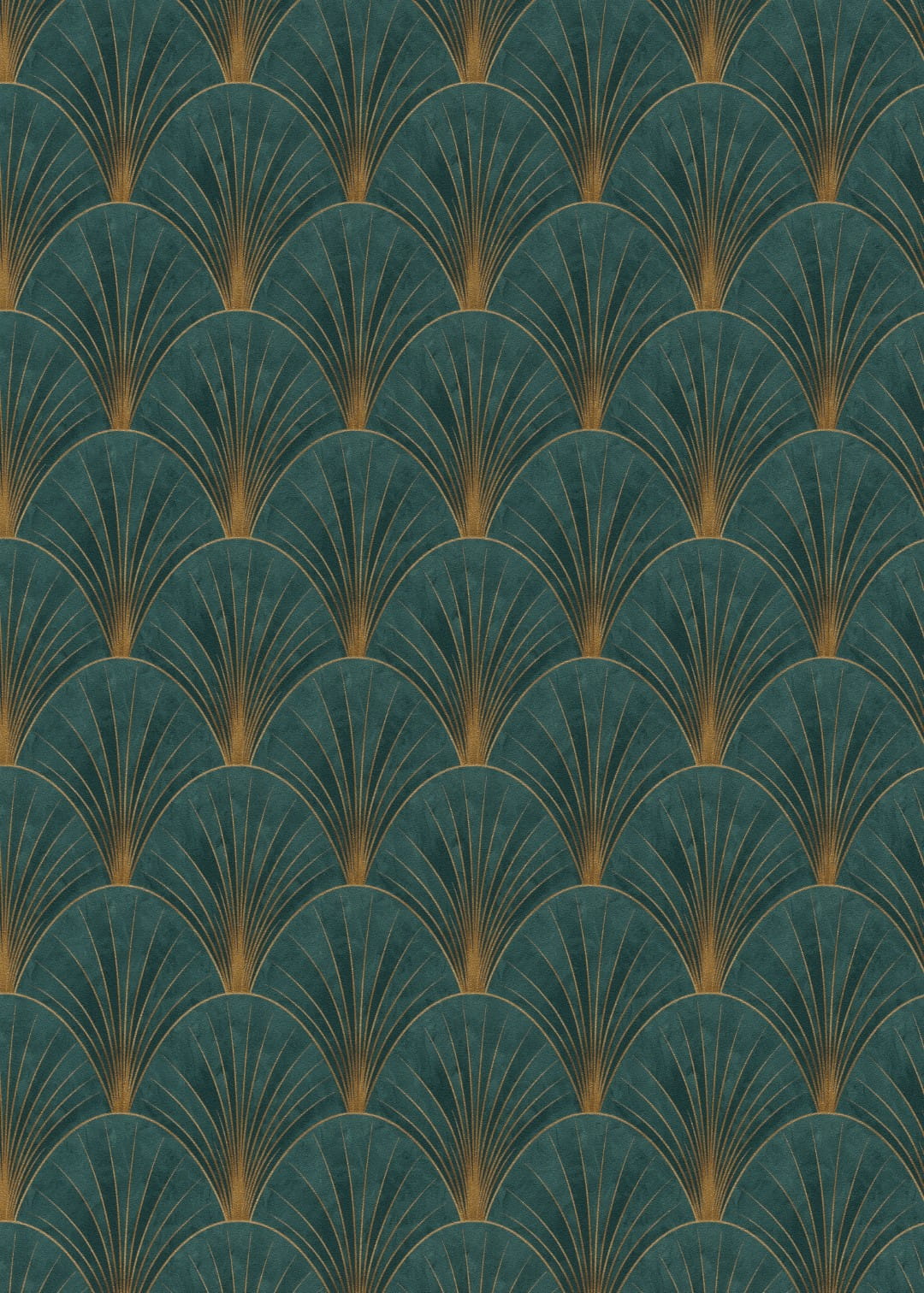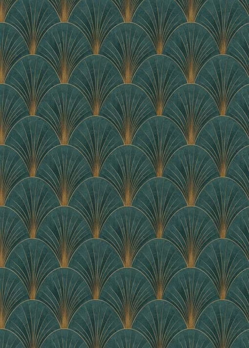 Prezentowana tapeta ścienna zachwyca eleganckim wzorem w stylu Artdeco, który przenosi w świat stylu glamour. Wzór składa się z harmonijnie ułożonych motywów, przypominających muszle czy wachlarze. Kolorystyka tapety opiera się na głębokich tonacjach ciemnej, butelkowej zieleni i złota. Złote elementy wzoru zostały podkreślone subtelnym, metalicznym połyskiem, co dodaje tapecie delikatnego blasku i luksusowego charakteru. Tapeta nie ma tłoczeń, jest gładka i lekko ziarnista w dotyku. Tapeta doskonale sprawdzi się jako główny element dekoracyjny na ścianie w salonie, jadalni, sypialni, biurze, czy też przedpokoju. Doskonale skomponuje się zarówno z nowoczesnym, jak i klasycznym wystrojem wnętrza. Świetnie będzie współgrać ze stylem Artdeco i glamour. Zastosowanie tapety jako dekoracji jednej ściany i zestawienie jej z pasującymi do niej tapetami, które prezentujemy poniżej pozwoli uzyskać spójny i modny wystrój wnętrza. Tapeta pochodzi z ekskluzywnej kolekcji „Elle Decoration 4”, niemieckiego producenta Erismann. Produkt winylowy na podłożu flizelinowym, wysokiej jakości, odporny na szorowanie.