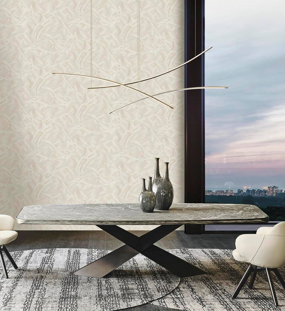 Ekskluzywna tapeta ścienna z kolekcji „Blumarine Home Collection N.5”, włoskiego producenta Emiliana Parati. Tapeta o strukturze i wyglądzie lekko pomarszczonej tkaniny, utrzymana w bladym odcieniu szarości z akcentami bieli. Powierzchnia tapety delikatnie się mieni i połyskuje srebrnym, opalizującym pyłkiem brokatu. Pięknie będzie współgrać z mocniejszym oświetleniem, zapewni wyjątkowo elegancki i przytulny styl wnętrza. Może stanowić samodzielną dekorację wszystkich czterech ścian, lub tworzyć modne zestawienie z innymi tapetami z kolekcji. Tapeta jest dostępna w wielu wersjach kolorystycznych. Certyfikowana tapeta winylowa na podłożu flizelinowym, odporna na szorowanie, dzięki czemu utrzymanie jej w czystości nie będzie stanowiło problemu. W rzeczywistości tapeta ma nieco chłodniejszą kolorystykę, niż przedstawia zdjęcie.