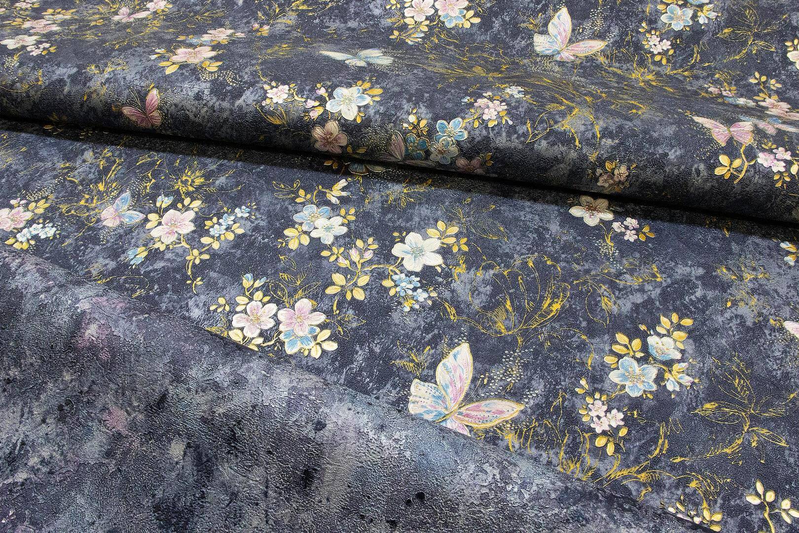 Ekskluzywna tapeta ścienna z kolekcji „Blumarine Home Collection N.5”, włoskiego producenta Emiliana Parati. Tapeta o strukturze dekoracyjnego tynku ściennego, z delikatnym motywem roślinnym, składającym się z drobnych, ulistnionych kwiatów i Motyli oraz samych, kwiatowych konturów. Kompozycja utrzymana w kolorze ciemnoniebieskim, różu, złocie i błękicie. Wzór z wyjątkiem kwiatowych konturów delikatnie się mieni i ma, srebrzysty metaliczny połysk a powierzchnia tła ma subtelną, srebrzystą poświatę. Tapeta pięknie będzie współgrać z mocniejszym oświetleniem, tworząc piękne refleksy na ścianie i nadając wnętrzu wyjątkowego charakteru. Gwarantuje przytulną i elegancką aranżację. Zastosowanie tapety jako dekoracji jednej, czy też dwóch ścian i zestawienie jej z tapetami, które prezentujemy poniżej pozwoli uzyskaj spójną i stylową aranżację. Certyfikowana tapeta winylowa na podłożu flizelinowym, odporna na szorowanie, dzięki czemu utrzymanie jej w czystości nie będzie stanowiło problemu.