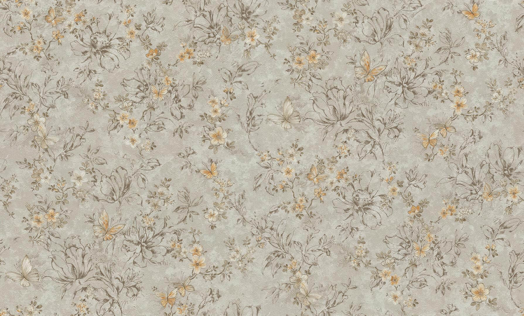 Ekskluzywna tapeta ścienna z kolekcji „Blumarine Home Collection N.5”, włoskiego producenta Emiliana Parati. Tapeta o strukturze dekoracyjnego tynku ściennego, z delikatnym motywem roślinnym, składającym się z drobnych, ulistnionych kwiatów i Motyli oraz samych, kwiatowych konturów. Kompozycja w ciemnym szaro-beżu i kolorze pomarańczowym, na jasnoszarym tle. Wzór z wyjątkiem konturów delikatnie się mieni i ma metaliczny, srebrzysty połysk połysk a powierzchnia tła ma subtelną, srebrzystą poświatę. Tapeta pięknie będzie współgrać z mocniejszym oświetleniem, tworząc piękne refleksy na ścianie i nadając wnętrzu wyjątkowego charakteru. Gwarantuje przytulną i elegancką aranżację. Zastosowanie tapety jako dekoracji jednej, czy też dwóch ścian i zestawienie jej z tapetami, które prezentujemy poniżej pozwoli uzyskaj spójną i stylową aranżację. Certyfikowana tapeta winylowa na podłożu flizelinowym, odporna na szorowanie, dzięki czemu utrzymanie jej w czystości nie będzie stanowiło problemu.