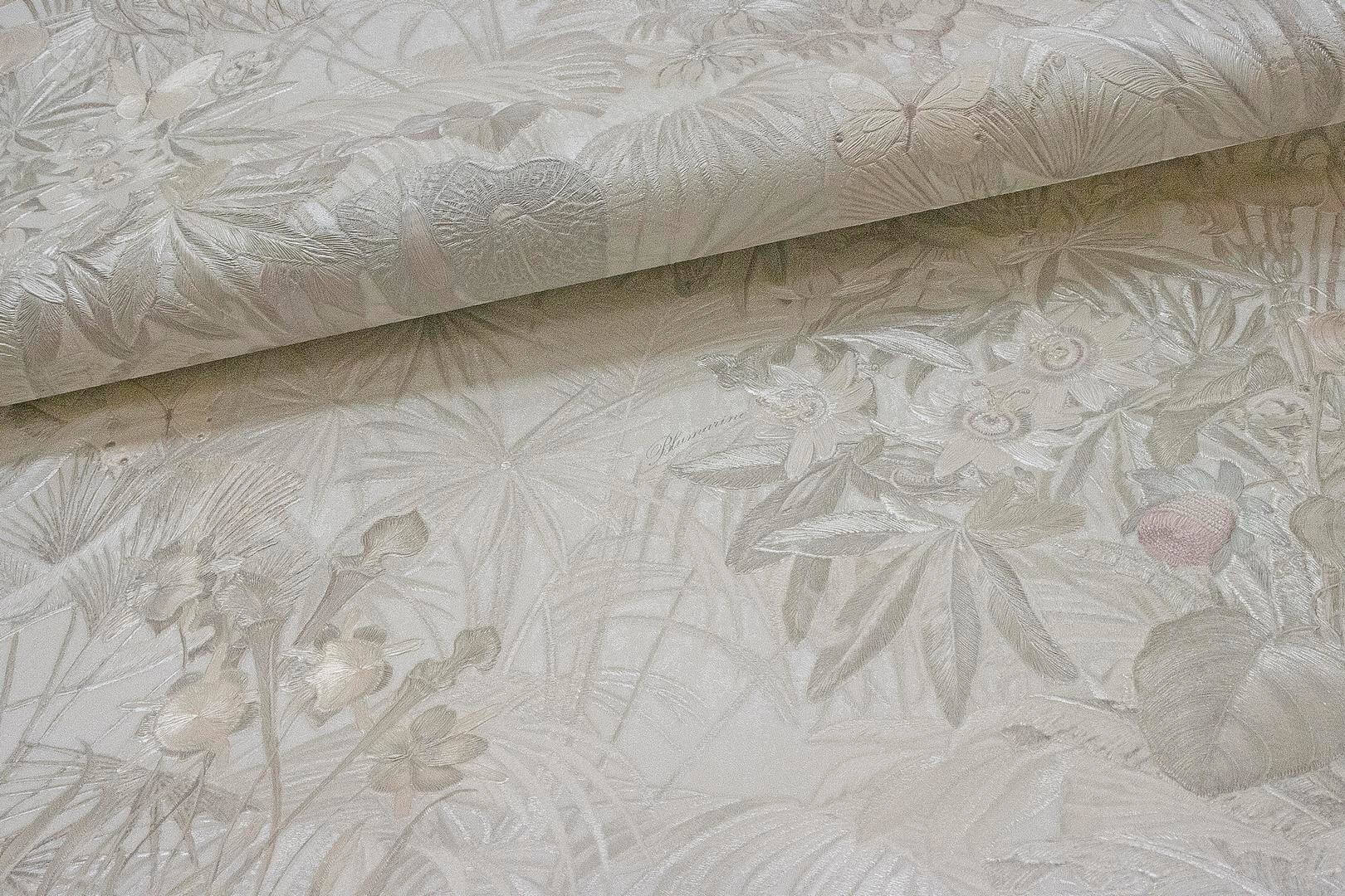 Ekskluzywna tapeta ścienna z kolekcji „Blumarine Home Collection N.5”, włoskiego producenta Emiliana Parati. Tapeta o strukturze tkaniny z motywem botanicznym, który do złudzenia naśladuje reliefowy haft. Tropikalny wzór zachwyca przeróżnymi formami liści, kwiatów oraz motylami. Kompozycja w delikatnych odcieniach szarości, z akcentami beżu, na białym tle. Tapeta oddaje satynowe refleksy i delikatnie się mieni, przez co wzór sprawia wrażenie trójwymiarowego, jego część ma srebrzyste, metaliczne wykończenie, pozostała część delikatnie odbija światło. Tapeta doskonale sprawdzi się jako dekoracja jednej ściany, tworząc stylowe zestawienie z jednokolorową tapetą o numerze: BM29054. Pięknie udekoruje nowoczesny salon, jadalnię, sypialnię, czy też pokój młodzieżowy, nadając wnętrzu wyrazistości i wyjątkowo przytulnego charakteru. Certyfikowana tapeta winylowa na podłożu flizelinowym, odporna na szorowanie, dzięki czemu utrzymanie jej w czystości nie będzie stanowiło problemu.