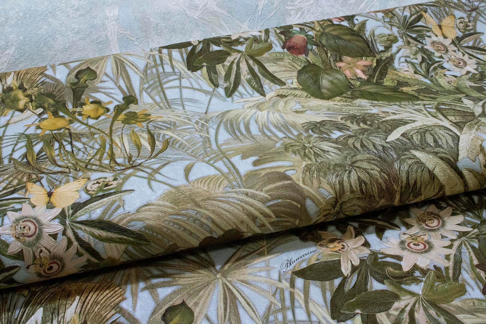 Ekskluzywna tapeta ścienna z kolekcji „Blumarine Home Collection N.5”, włoskiego producenta Emiliana Parati. Tapeta o strukturze tkaniny z motywem botanicznym, który do złudzenia naśladuje reliefowy haft. Tropikalny wzór zachwyca przeróżnymi formami liści, kwiatów oraz motylami. Barwna kompozycja składa się ze spokojnych odcieni zieleni, beżu, brązu, bordo, pomarańczowego i różu, które wypełniają blade, błękitne tło. Tapeta pięknie odbija światło i delikatnie się mieni, przez co wzór sprawia wrażenie trójwymiarowego. Tapeta doskonale sprawdzi się jako dekoracja jednej ściany, tworząc stylowe zestawienie z jednokolorową tapetą o numerze: BM29056. Pięknie udekoruje nowoczesny salon, jadalnię, sypialnię, czy też pokój młodzieżowy, nadając wnętrzu wyrazistości i wyjątkowo przytulnego charakteru. Certyfikowana tapeta winylowa na podłożu flizelinowym, odporna na szorowanie, dzięki czemu utrzymanie jej w czystości nie będzie stanowiło problemu.