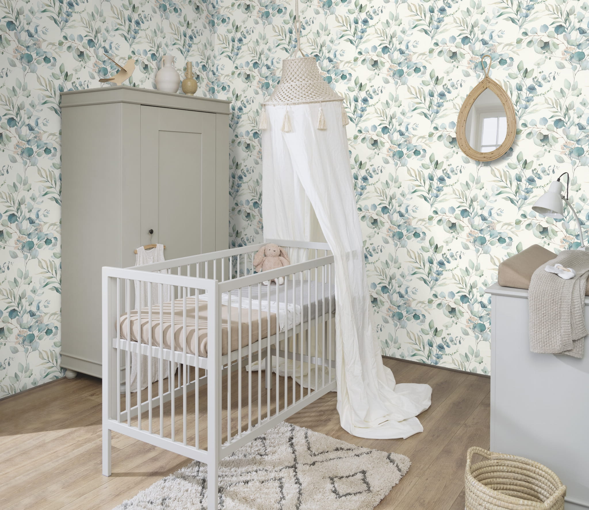 Tapeta z malowanym akwarelą motywem roślinnym. Kompozycji przewodzą gałązki Eukaliptusa w spokojnych odcieniach zieleni, niebieskiego oraz beż, brązu i szarości, na białym tle. Struktura tapety jest gładka i ma matowe wykończenie. Tapeta pochodzi z dziecięcej kolekcji "Kids World", projektu Rasch. Pomoże zaaranżować przytulną i odprężającą przestrzeń najmłodszym, jak i odmienić styl salonu, jadalni, czy też sypialni. Aby uzyskać spójną i modną aranżację wnętrza warto zastosować tapetę jako dekorację jednej ściany i dopasować do niej tapety jednokolorowe: 252804, 252842 i 252880. Podłoże tapety flizelinowe, ekologiczne - wolne od polichlorku winylu.
