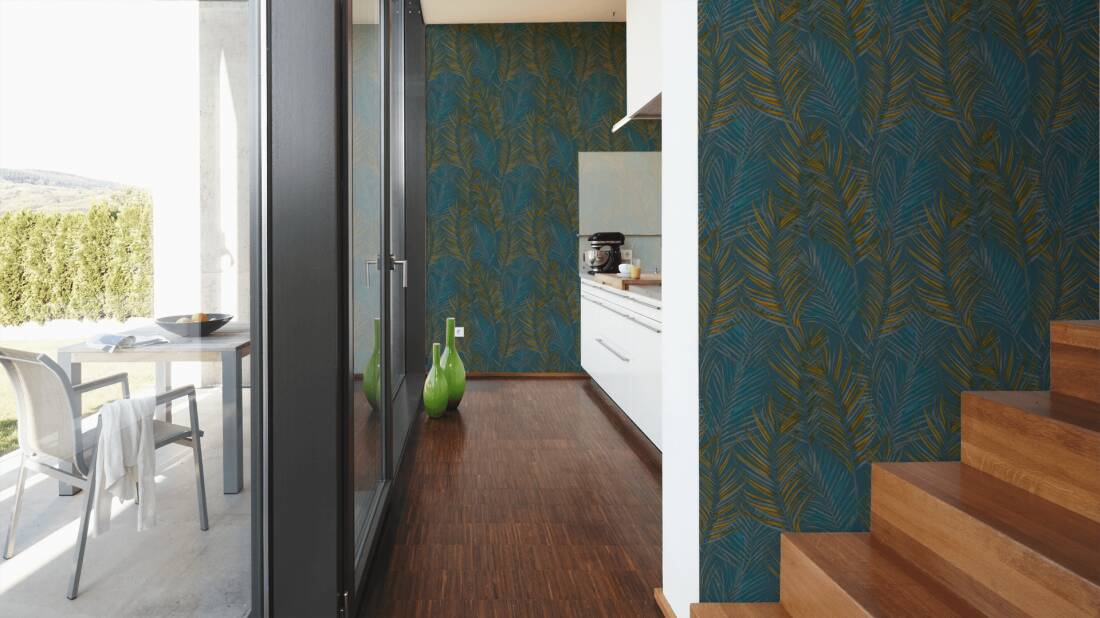 Tło tapety jest matowe i jednolite, w kolorze turkusowym. Wzór jest w kilku odcieniach turkusu, popieli i złoto-żółtego oraz posiada połyskującą poświatę, która mieni się pod wpływem światła.