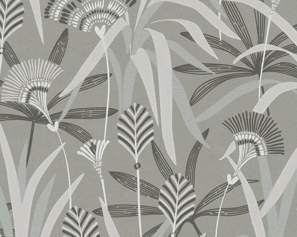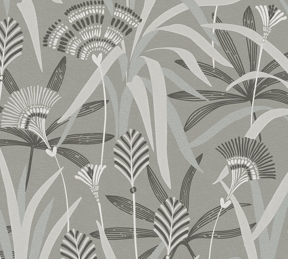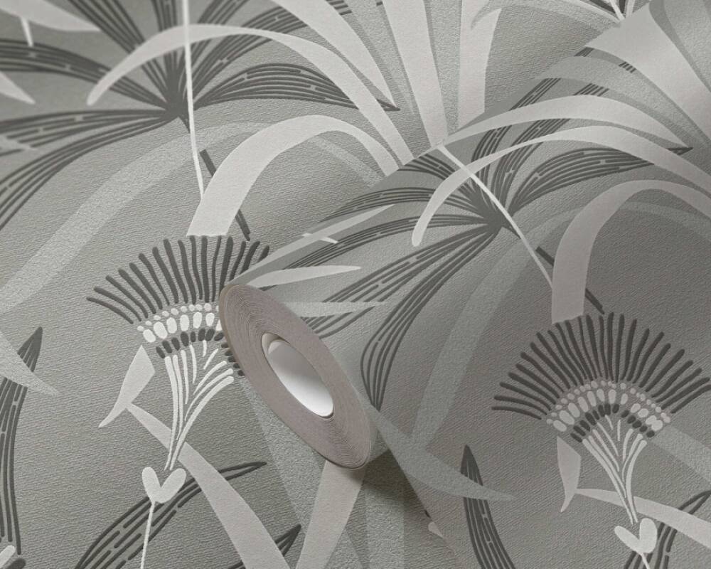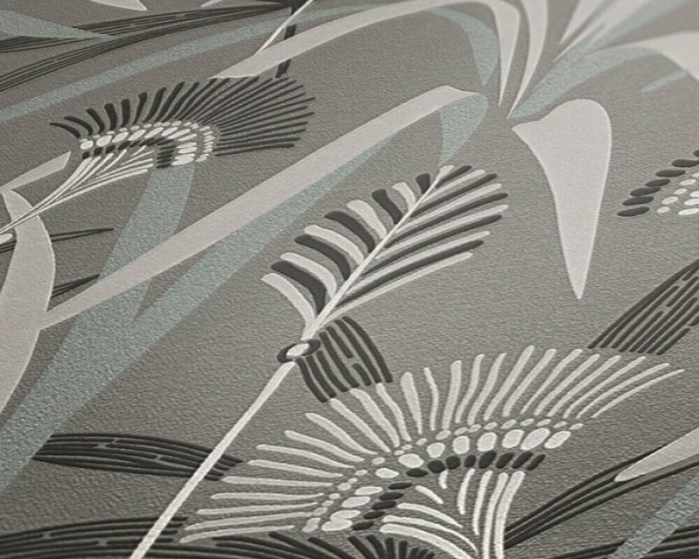 Prezentowaną tapetę ścienną z kolekcji "French Affair" od A.S. Creation wyróżnia wyrazisty wzór w stylu art deco, inspirowany tropikalną roślinnością. Motywem przewodnim są liście i kwiaty, które zostały przedstawione w artystycznym, nowoczesnym wydaniu. Elementy w delikatnym odcieniu błękitu, jasnej szarości oraz bieli i czerni kontrastują ze spokojnym, szarym tłem, które nadaje kompozycji eleganckiego charakteru. Błękitne liście mają metaliczne wykończenie, dzięki czemu subtelnie odbijają światło tworząc efekt głębi i refleksy. Faktura powierzchni jest miękka, gąbczasta i nieco szorstka w dotyku, elementy wzoru są lekko wyczuwalne pod palcami.