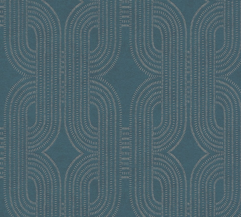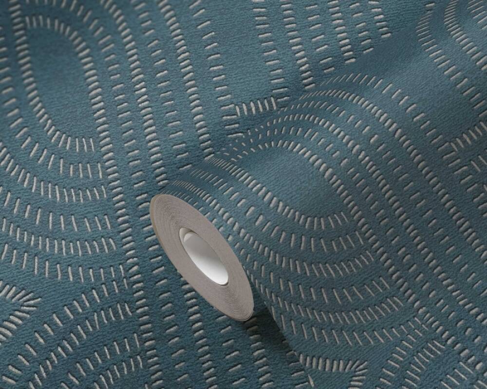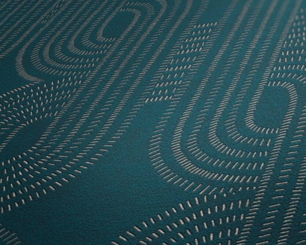 Tapeta z kolekcji "French Affair" od A.S. Creation to elegancka dekoracja ścienna, która przyciąga uwagę subtelnym wzorem, wzbogaconym o delikatny, metaliczny połysk. Motyw tworzą delikatne, płynnie przenikające się linie, utworzone z drobniutkich, połyskujących prążków w odcieniu brązu i beżu. Kolorem bazowym jest głęboki, ciemnoniebieski odcień wpadający w petrol. Wzór subtelnie odbija światło, tworząc wrażenie głębi i zmieniającego się efektu w zależności od oświetlenia i kąta padania światła. Dzięki temu tapeta wydaje się dynamiczna, ale nadal pozostaje subtelna i nieprzytłaczająca.