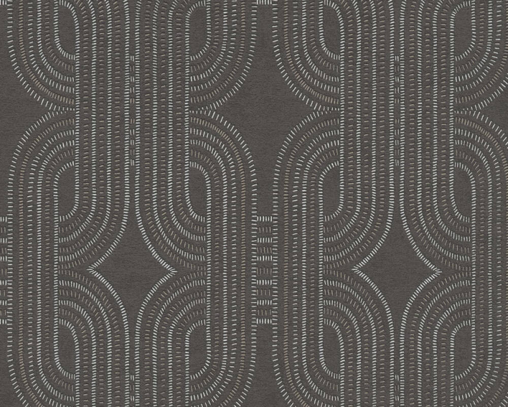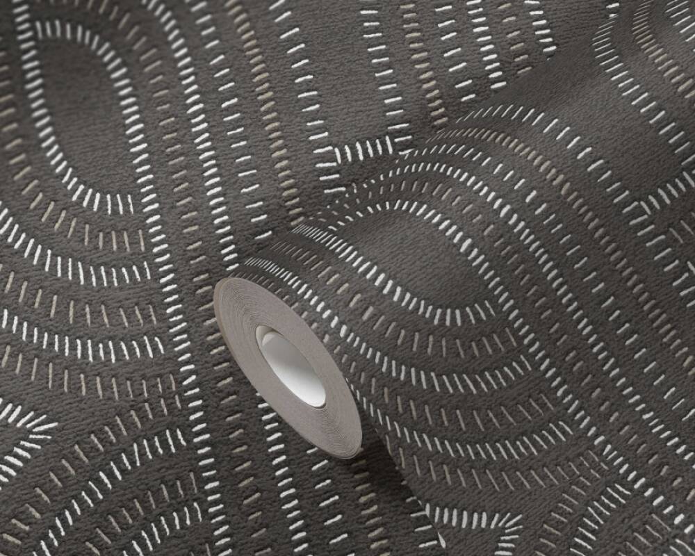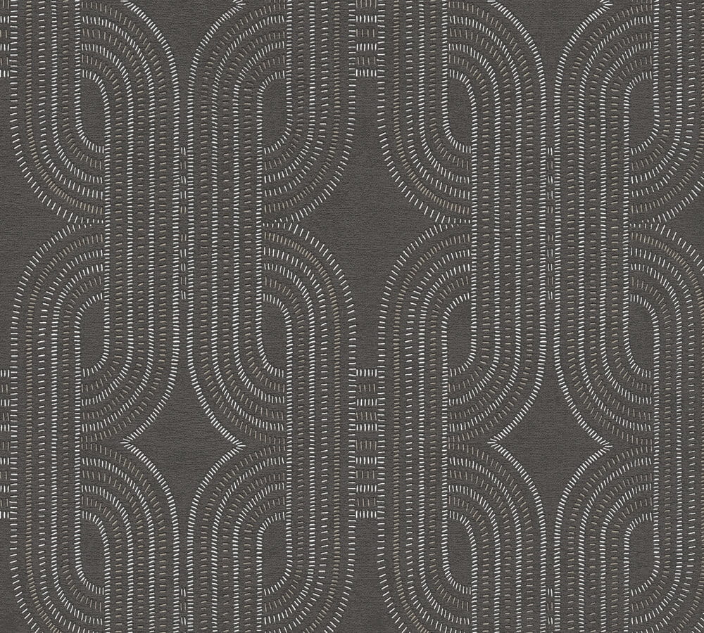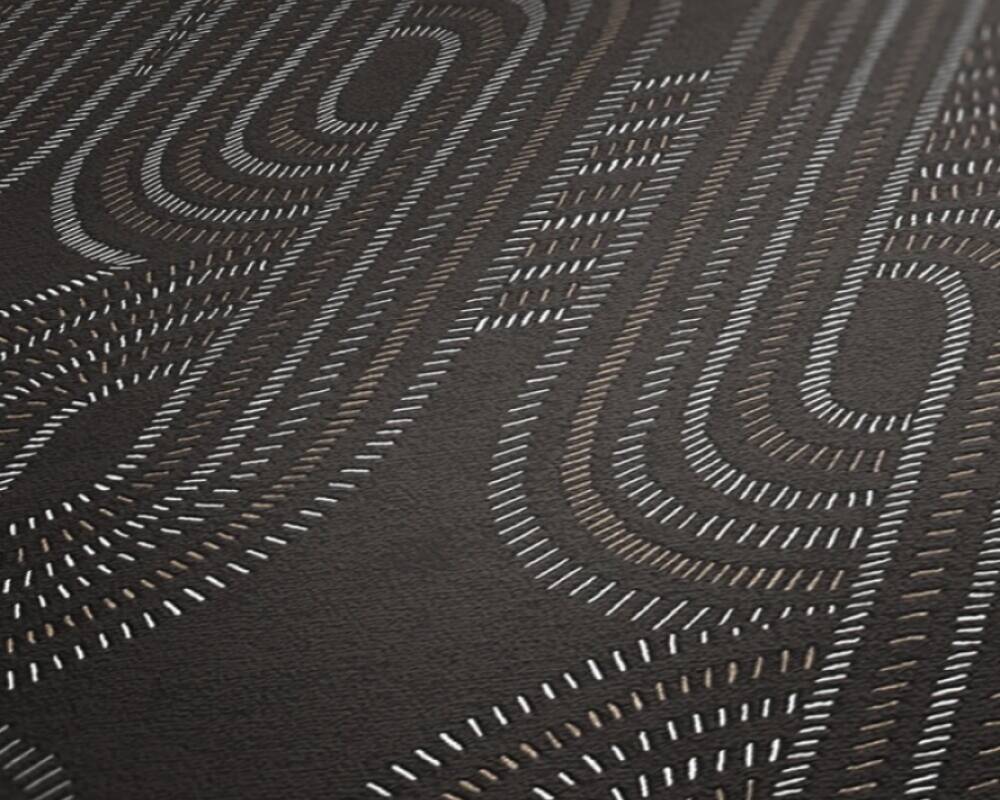 Tapeta z kolekcji "French Affair" od A.S. Creation to elegancka dekoracja ścienna, która przyciąga uwagę subtelnym wzorem, wzbogaconym o delikatny, metaliczny połysk. Motyw tworzą delikatne, płynnie przenikające się linie, utworzone z drobniutkich, połyskujących prążków w odcieniu srebra i złotawego brązu. Kolorem bazowym jest elegancka czerń. Wzór subtelnie odbija światło, tworząc wrażenie głębi i zmieniającego się efektu w zależności od oświetlenia i kąta padania światła. Dzięki temu tapeta wydaje się dynamiczna, ale nadal pozostaje subtelna i nieprzytłaczająca.