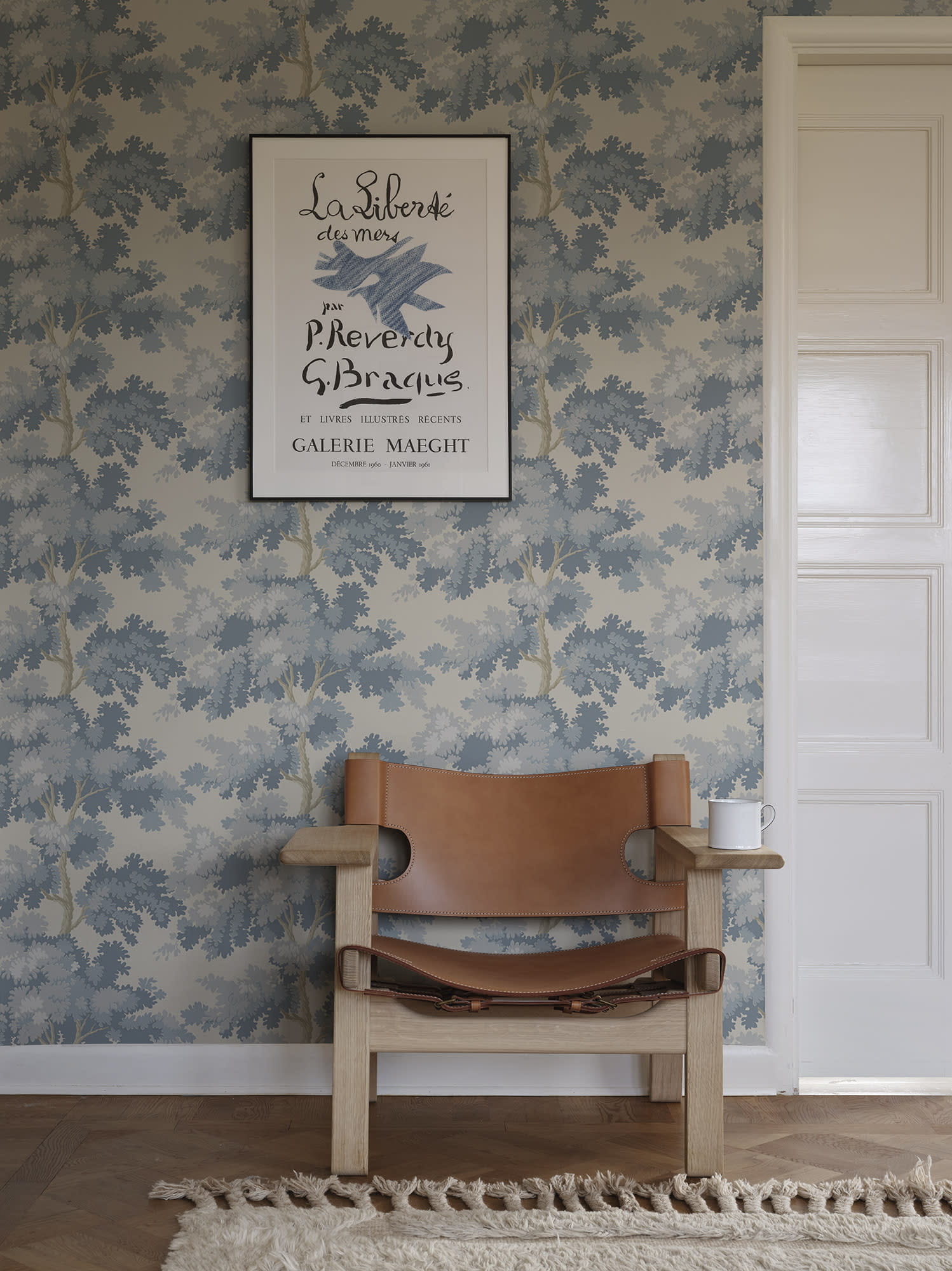Ekskluzywna tapeta ścienna z kolekcji „Tidlosa”, producenta Sandberg, to wyjątkowa okleina ścienna, która przyciąga wzrok motywem botanicznym, który w niepowtarzalny sposób odmieni styl wnętrza. Leśny deseń, przedstawiający wierzchołki drzew to idealny przepis na stworzenie klimatycznej aranżacji o odprężającym i przytulnym charakterze. Naturalny styl tapety podkreśla spokojna kolorystyka, która łączy chłodne odcienie niebieskiego oraz szarość i szarą biel z kremowym kolorem tła. Wykończenie tapety jest matowe a struktura niemal idealnie gładka w dotyku. Pod palcami można wyczuć miejscami kontury pni drzew. Projekt „Raphael” producenta Sandberg jest jednym z najpopularniejszych. Inspiracją do jego powstania były antyczne gobeliny a także nowojorski Central Park, gdzie zieleń otoczona szklano-betonowymi drapaczami pięknie kontrastuje z tętniącym życiem miastem. Tapeta sprawdzi się jako samodzielna dekoracja ścian, może też stworzyć stylowe zestawienie z innymi tapetami z kolekcji, co nada wnętrzu jeszcze bardziej wyszukanego stylu. Tapeta flizelinowa, charakteryzująca się dobrą odpornością na zmywanie, dzięki czemu jej powierzchnię można bardzo delikatnie przecierać ściereczką.