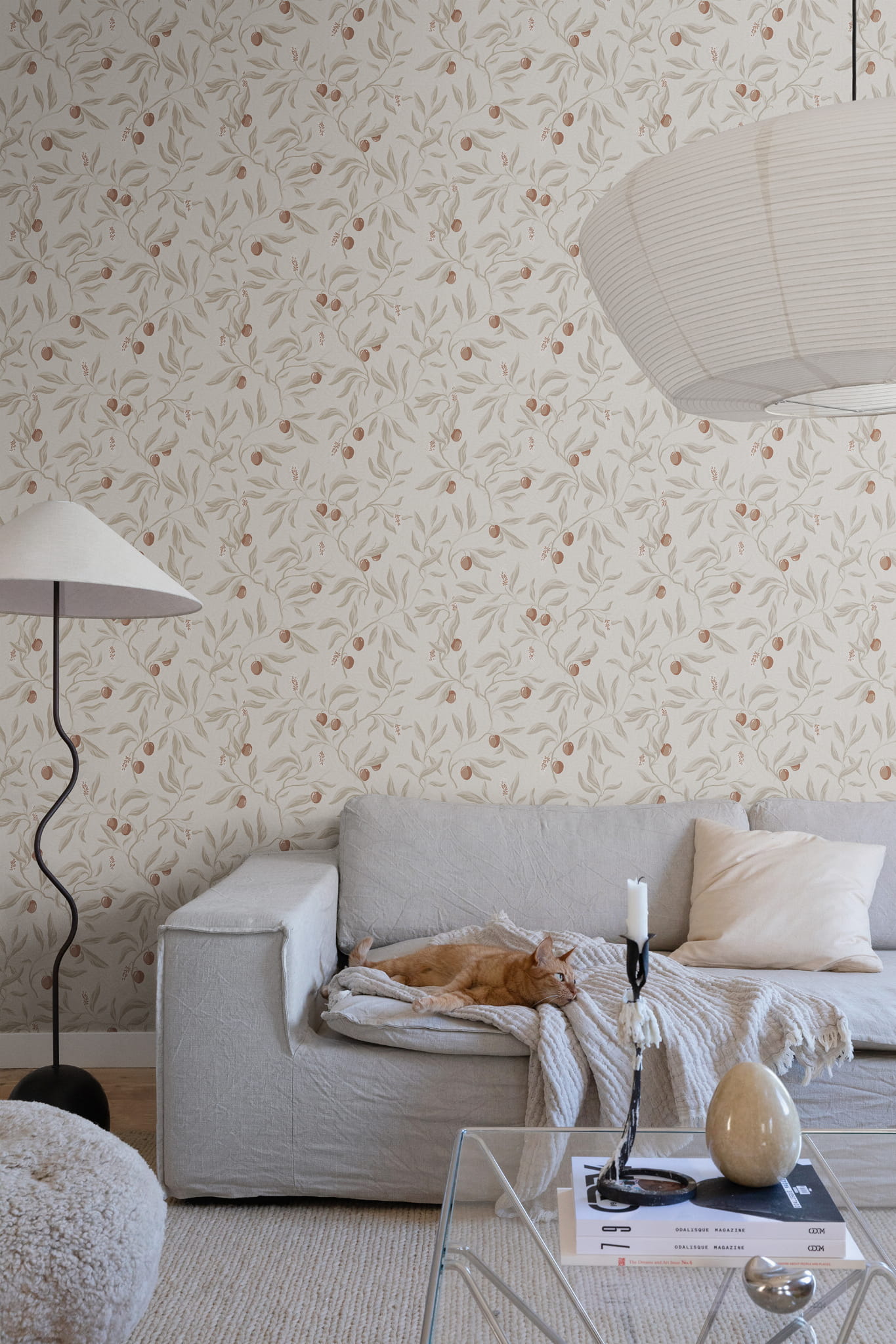 Ekskluzywna tapeta ścienna z kolekcji "Villa Dallarö II", szwedzkiego producenta Sandberg. Projekt "Vinnie", którego autorką jest Sara Bergqvist to piękne, malowane gałązki z owocami liczi. Na drugim tle można dostrzec może drobniutkich, delikatnych listków. Ponadczasowy wzór wykonany tradycyjną techniką druku, która nadaje tapecie teksturowaną powierzchnię i żywy charakter. Kompozycję charakteryzuje delikatna i spokojna kolorystyka, która łączy szare beże z szarością, bielą i ciepłym brązem. Wykończenie tapety jest matowe a jej struktura bardzo delikatnie tłoczona. Pod palcami można nieco wyczuć niektóre elementy wzoru. Tapeta świetnie nadaje się, zarówno do nowoczesnych, jak i klasycznie urządzonych wnętrz. Szczególnie pięknie będzie współgrać z ciepłym, rustykalnym wystrojem. W wyjątkowy sposób odmieni styl salonu, jadalni, sypialni, przedpokoju, biura, czy też młodzieżowego a nawet i dziecięcego wnętrza. Tapeta powodzeniem może stanowić samodzielną dekorację wszystkich ścian w pomieszczeniu, jak i tworzyć modne zestawienie z innymi tapetami z kolekcji, na przykład tymi, które prezentujemy poniżej. Tapeta o numerze S10190 jest tapetą flizelinową, ekologiczną, zmywalną w dobrym stopniu, dzięki czemu może być bardzo delikatnie przecierana ściereczką.