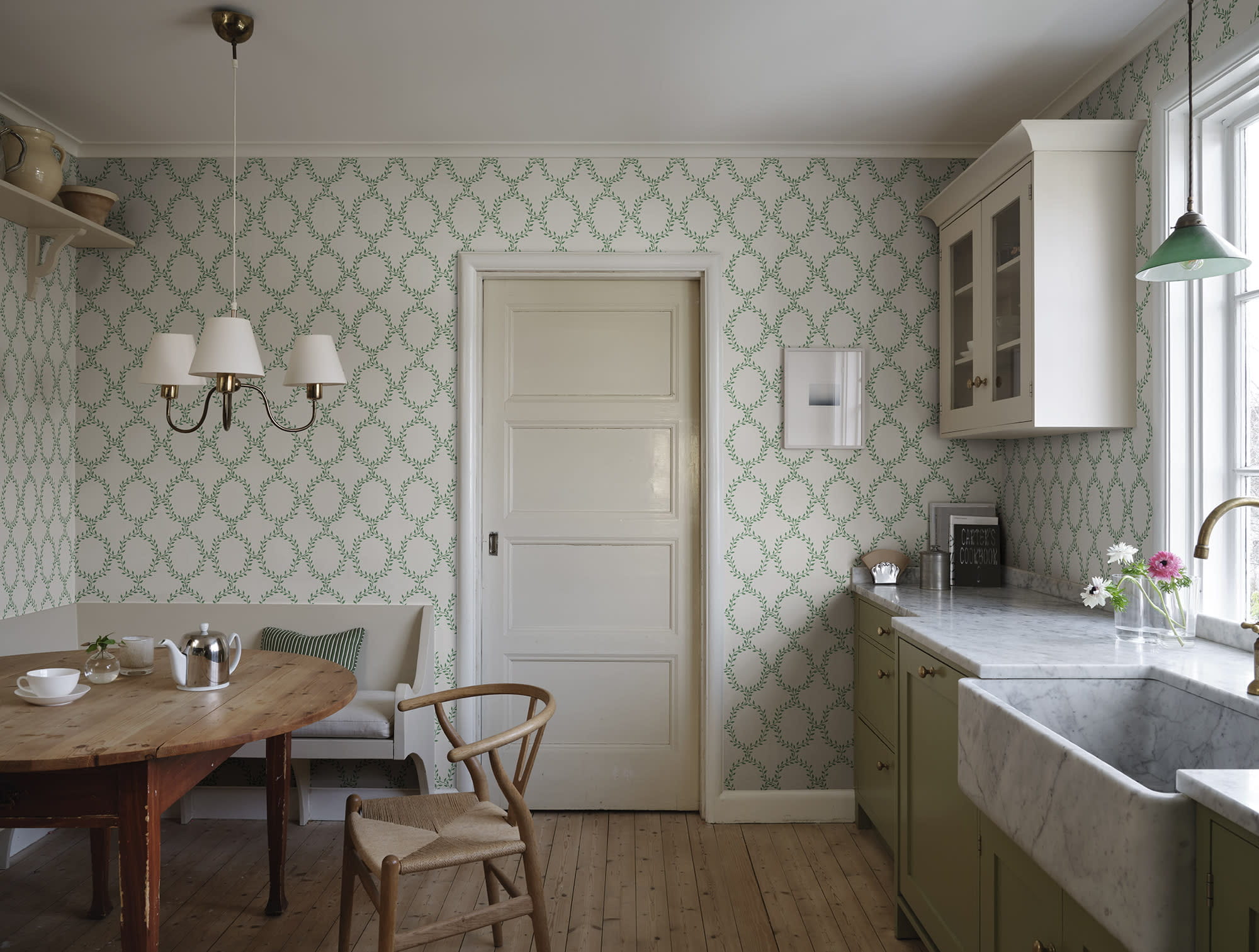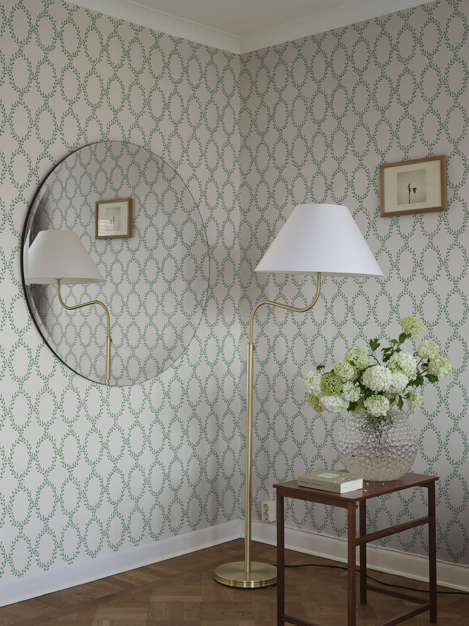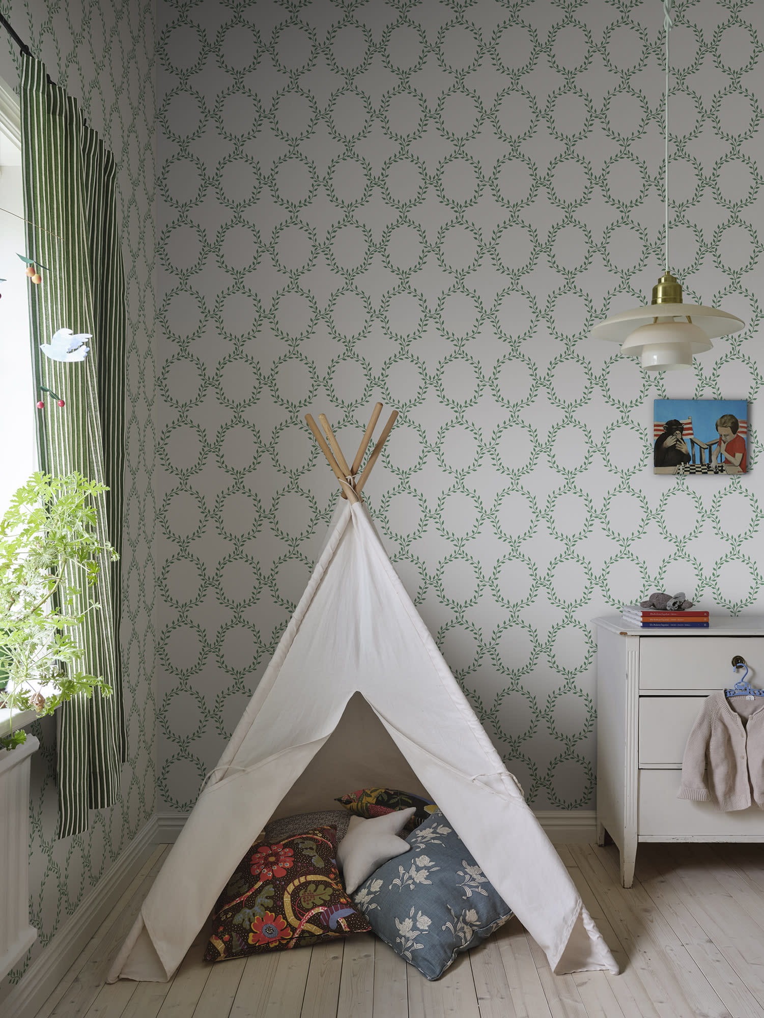 Ekskluzywna tapeta ścienna z kolekcji "Tidlosa", producenta Sandberg. Projekt "Wilma" to tapeta z delikatnym, roślinnym deseniem, który przywodzi na myśl wieńce laurowe. Spokojna kolorystyka, która łączy zieleń wzoru z bielą tła podkreśla lekki i przytulny styl kompozycji. Struktura tapety jest idealnie gładka a wykończenie matowe. Z bliska można dostrzec, że białe tło, wyglądem przypomina płócienny materiał, co dodatkowo wzmacnia naturalny efekt. Idealny przepis na stworzenie stylowej aranżacji salonu, jadalni, sypialni, przedpokoju, biura, pokoju młodzieżowego a nawet pokoju dziecięcego. Subtelny motyw będzie modnym dopełnieniem zarówno klasycznej, jak i nowoczesnej aranżacji. Pięknie będzie prezentować się jako samodzielna dekoracja całego pomieszczenia, jak i w stylowym zestawieniu z innymi tapetami z kolekcji. Tapeta flizelinowa, charakteryzująca się dobrą odpornością na zmywanie, dzięki czemu jej powierzchnię można bardzo delikatnie przecierać ściereczką.