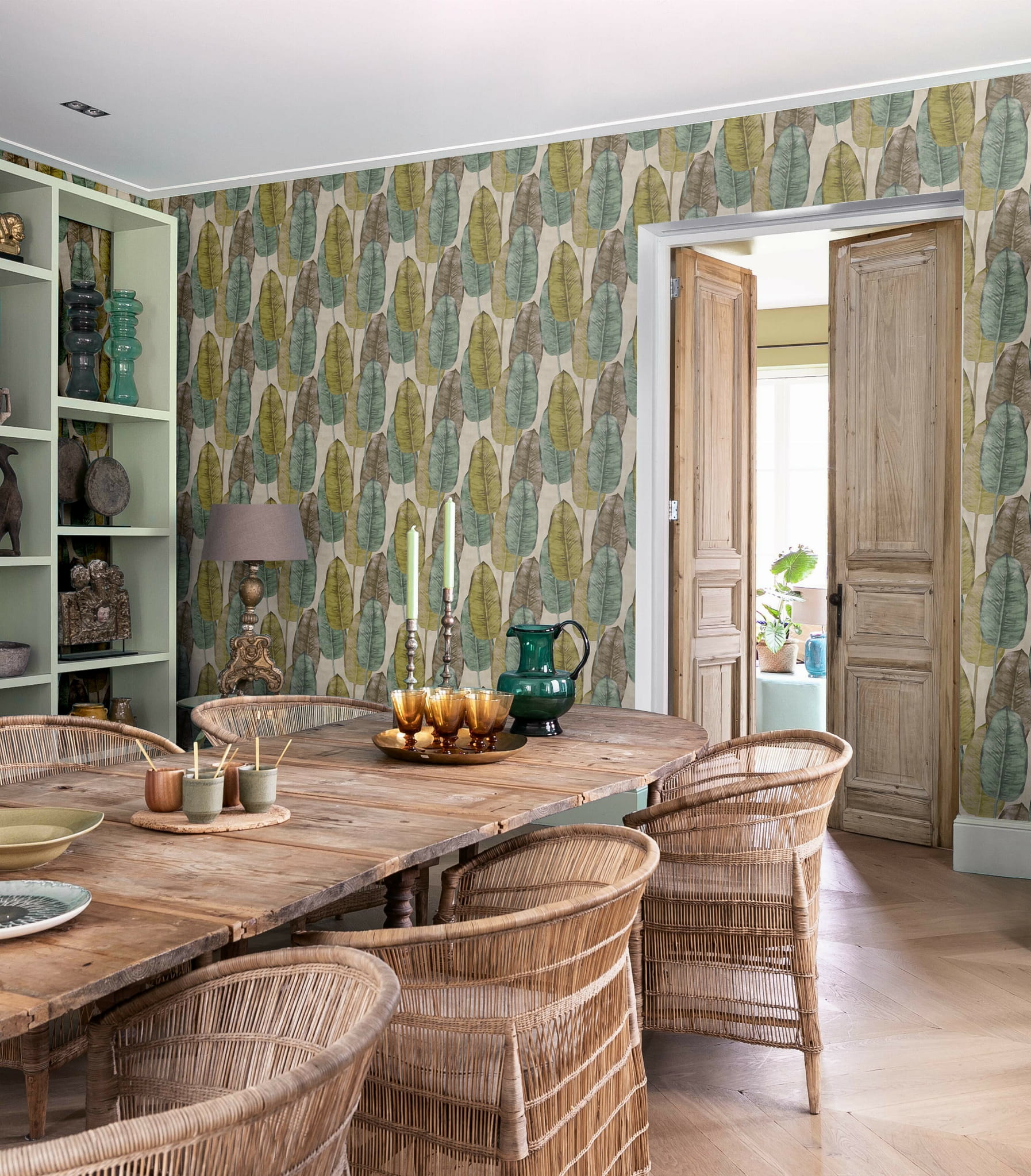 Ekskluzywna tapeta ścienna z kolekcji „Tahiti”, belgijskiego producenta Decoprint. Motyw dużych liści palmowych w technice akwareli, na tapecie o strukturze luźno tkanego, matowego płótna. Kompozycję wyróżnia spokojna kolorystyka, będąca zestawieniem musztardowej żółci, szarego brązu i miętowej zieleni z bladym, szarawym beżem, który jest kolorem tła. Tło jest niejednolite, z widocznym efektem akwarelowego rozmycia. Dekoracja o przytulnym i naturalnym charakterze, która pozwoli stworzyć wnętrze o wyjątkowo relaksującym klimacie. Świetnie pasuje do wnętrz nowoczesnych, urządzonych w stylu boho, czy na przykład w klimacie miejskiej dżungli. Odmieni styl salonu, jadalni, sypialni, pokoju młodzieżowego, biura, czy też dużego przedpokoju. Zastosowanie tapety jako dekoracji jednej ściany i zestawienie jej z pasującymi do niej tapetami jednokolorowymi, które prezentujemy poniżej pozwoli uzyskać spójną i modną aranżację wnętrza. Tapeta winylowa na podłożu flizelinowym, zmywalna. w bardzo dobrym stopniu.